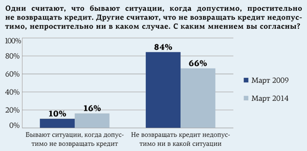 Важный штрих — мнение россиян о приемлемости невыплаты кредита. Только 66% всех опрошенных заявили о том, что не возвращать кредит недопустимо, а среди людей, которые оценивают вероятность невозврата собственного кредита как высокую, таких ещё меньше — только 52%. Остальные либо считают такую ситуацию возможной, либо не определились со своим мнением. Даже весной 2009 года намерения людей были более благоприятными для банков: 84% респондентов ни при каких обстоятельствах не считали возможным остановить гашение задолженности.