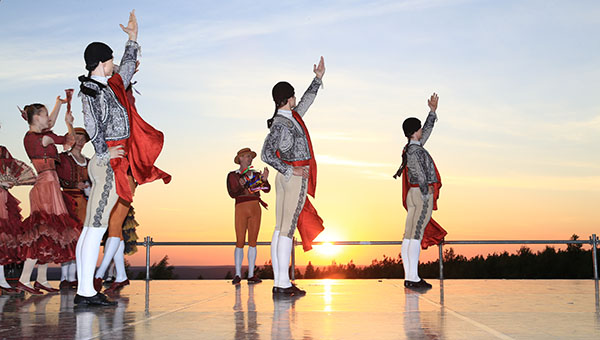 Выбор «Дон Кихота» для показа на горе — отличная идея. Испанский колорит, все эти страсти и выяснения отношений, матадоры и уличные танцовщицы, красавцы и красавицы, веера и кружева отлично рифмуются с золотым, алым и фиолетовым цветом неба. А вечерняя прохлада (к счастью, настоящего холода и ветра, в отличие от прошлого года, на горе в этот раз не случилось), казалось, лишь добавляла артистам драйва и азарта. И даже небольшой размер сцены не помешал — ни толкучки, ни путаницы, идеальные ряды кордебалета, красивые проходы — всё это особенно эффектно смотрелось с «верхнего яруса» — со скал, куда многие зрители отправились, вооруживших биноклями и даже целыми телескопами.