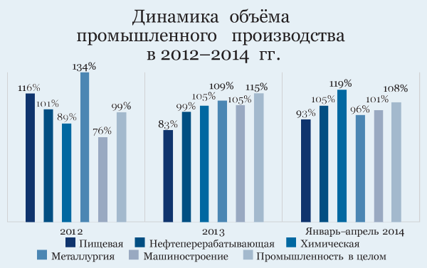 Интересно и то, что в этот же период пищевая промышленность России в целом показывает положительную динамику (и какую!) — 127% к уровню января—апреля 2014 года. В то же время все послекризисные годы до 2012-го