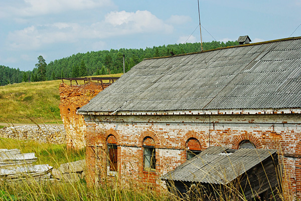 По другую сторону заводской конторы, если оглянуться вслед убегающей к Графскому парку плотине, открывается вид на развороченные краснокирпичные внутренности заводских цехов. Крепостной кладки башенка канатной дороги и вовсе являет собой жалкий осколок, наполовину утонувший в груде заросшего травой шлака.