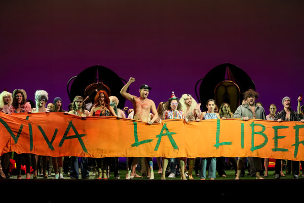 Главный же хит спектакля — это, конечно, гигантский транспарант с надписью Viva La Liberta, появляющийся в центральной сцене, свадьбе Церлины и Мазетто, которую Дон Жуан устроил для простолюдинов в своём замке. В этом слогане усмотрели многое: и протест театра против попытки краевого минкульта навязать новые условия государственного задания, и даже намёки на российскую политическую ситуацию.
