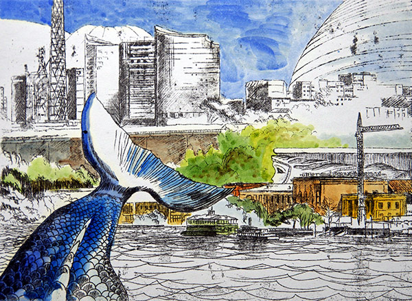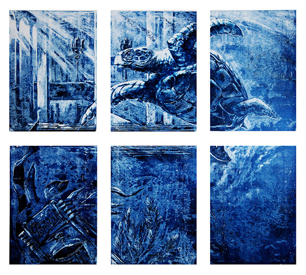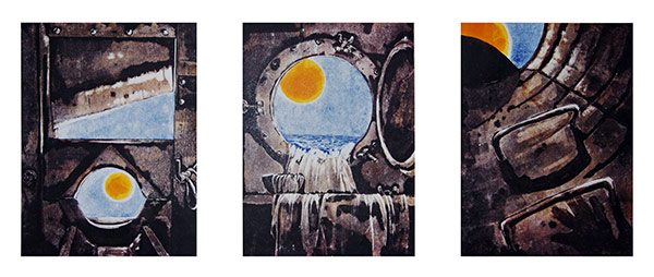Утопающий Органный зал. Торчащий над водой обод колеса обозрения из парка Горького. Уходящий из воды в воду Камский мост… Это Пермь — и не Пермь. Над водой возвышаются высокие и тонкие шпили и башни, и ясно, что человечество выжило. Оно не освоило водные глубины, но научилось жить над ними: люди летают на стрекозиных крыльях и путешествуют на дирижаблях с человеческими лицами. На одной из монотипий гигантская черепаха плывёт мимо фасада Театра-Театра к баночке из-под попкорна. Видимо, готовится созерцать закат цивилизации, попкорном запасается. Но до заката здесь далеко, человечество не сдаётся. Да, собственно, нет необходимости бороться или сдаваться: этот мир прекрасен, как и его жители.