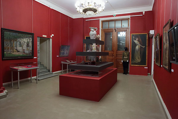 Экспозиция начинается с зала, где в красивом интерьере собраны последние приметы мирного времени: фарфоровые безделушки, парадные женские портреты, экспрессивные пейзажи, авторы которых безудержно радуются новым возможностям, открывшимся для живописи. Прогулки на байдарках, парадные обеды, красивые женщины… И звук потрескивающего патефона с томным романсом. «Вы просите песен?» — вопрошает Иза Кремер, а Анастасия Вяльцева вторит: «В лунном сиянье снег серебрится…»