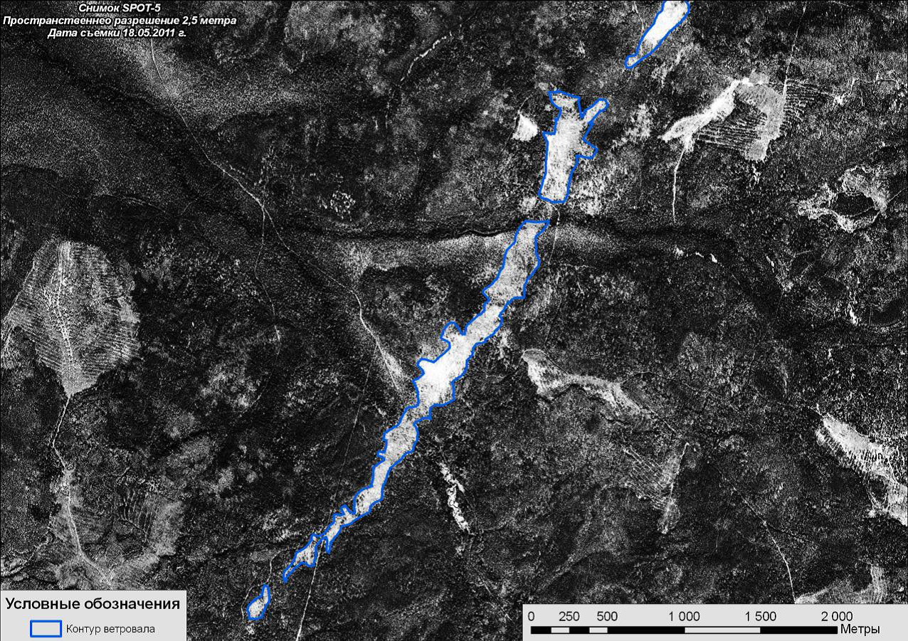Мы продолжаем рассматривать последствия шквала 2010 года в Кочёвском лесничестве, сделанные двумя годами позже с разрешением до метра на пиксель. Сиреневое — это лежащий лес. Зелёное — то, что осталось стоять. Образ, написанный светом. Импрессионизм, а может быть, мистическое искусство космоса? Пострадало более 8000 га. В течение одного дня! Десятки миллионов рублей улетели на ветер. Кроме того, в зону ветровала попали Красновишерский и Чердынский районы.