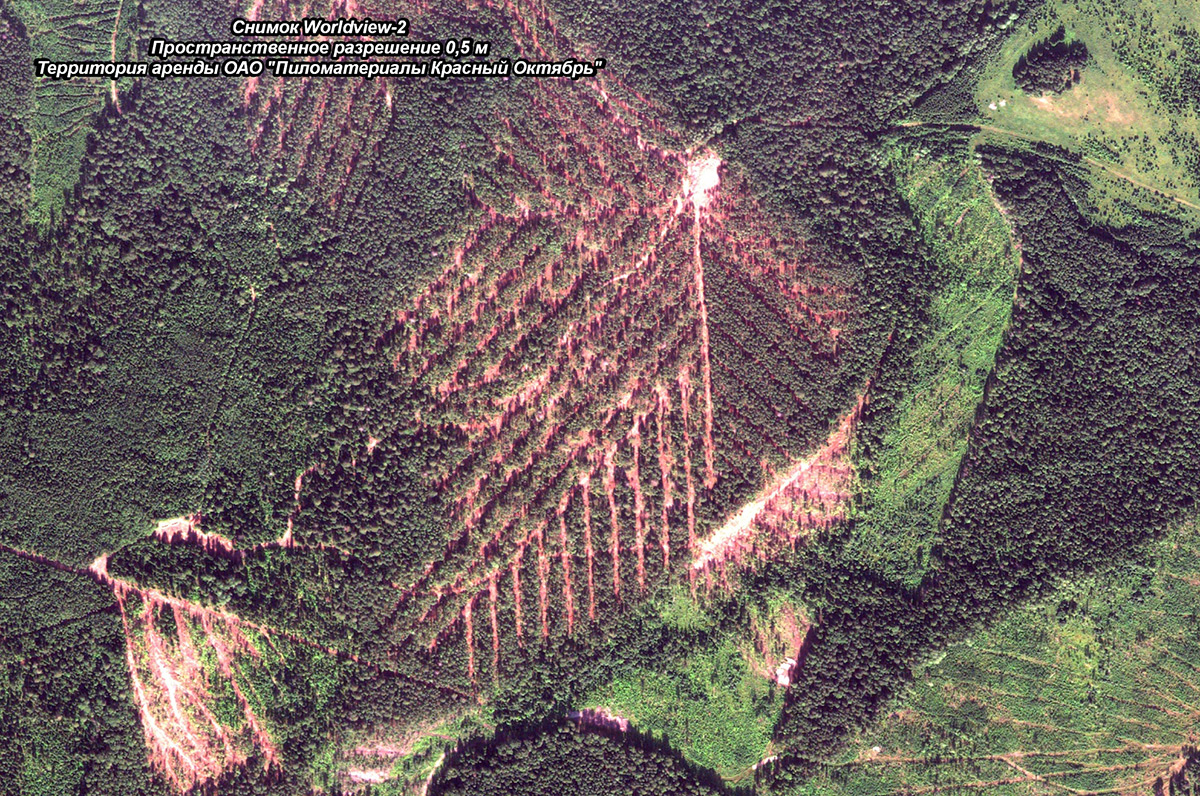 А вот так происходит выборочная рубка леса на территории, которую арендует одно пермское предприятие. Как будто медведь провёл своей когтистой лапой. А может быть, это наскальная живопись? Вот снимки одной и той же территории, сделанные в разное время, что позволяет видеть, как ведётся вырубка. Так выглядят выборочные рубки на снимке с 10-метровым разрешением. Тут — лесопосадки.