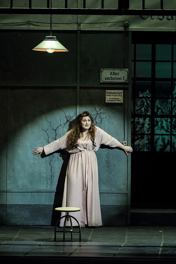 Дальше всё грустнее. Второе и третье действия уже не дают материала для эксцентрики, а драма и трагедия дались постановщикам гораздо хуже. Во втором действии Катерина Евангелатос перенесла действие в альпийский санаторий 1930-х годов, тем самым создав целый букет аллюзий с немецкой литературой ХХ века, что само по себе очень уместно и приятно. Но Галя Солодовникова этот замысел вовсе не подчеркнула (хотя лесистый видеопейзаж за окном, где то идёт снег, то сверкают зарницы, очень эффектен и эстетичен). Если не читать программку, ни за что не догадаешься, где и когда находится эта психушка. Наверное, чувствуя это, постановщики добавили надпись готическим шрифтом: Gesundheit ist die erste Dilicht im Leben («Здоровье — это первая обязанность в жизни»).