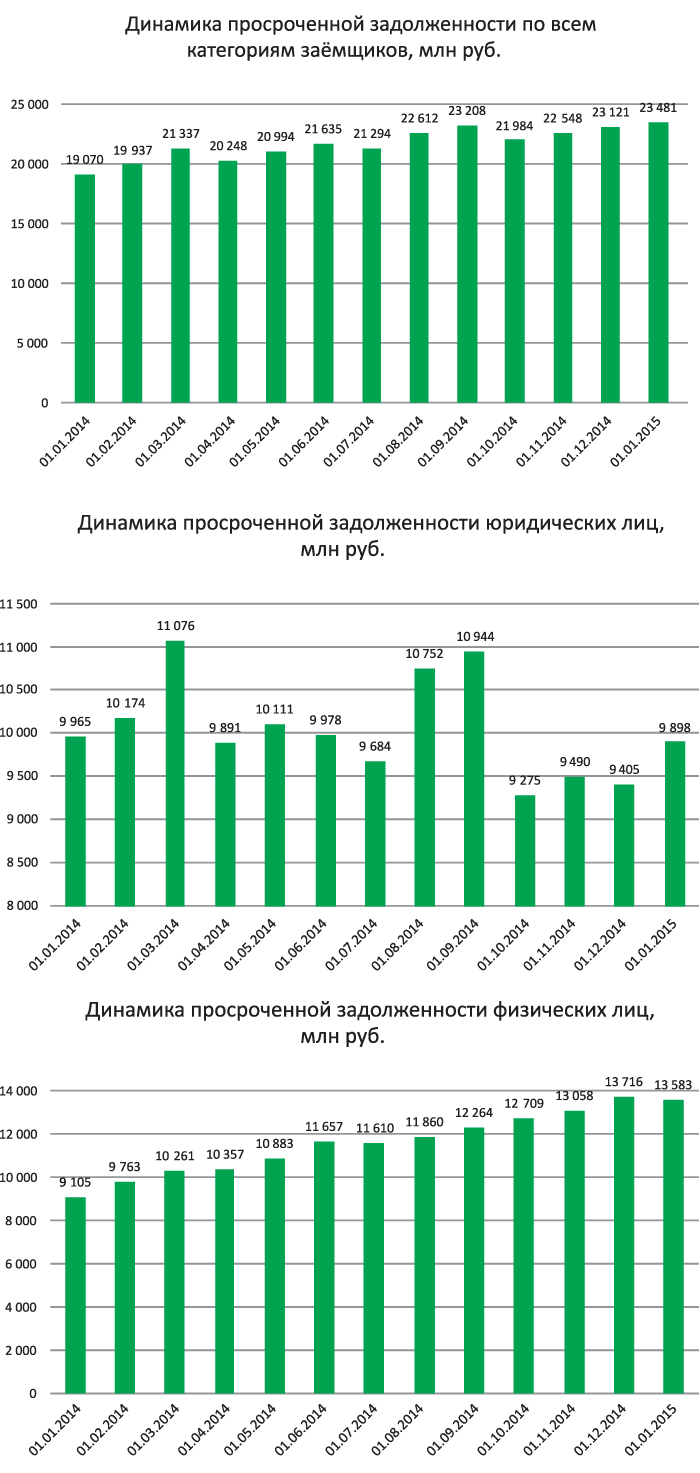 Ещё одно немаловажное направление работы банков во втором полугодии — это нормализация платёжной дисциплины и взыскание задолженности по кредитам. В результате предпринятых усилий средний по рынку уровень просрочки на 1 января 2015 года составил лишь 3%, даже снизившись по сравнению с аналогичной датой предыдущего года на 1%, но увеличившись в абсолютном выражении на 161 млрд руб. Однако по разным категориям заёмщиков динамика просрочки была неравномерной: в сегменте юридических лиц её удалось снизить, по кредитам населения она, напротив, росла.
