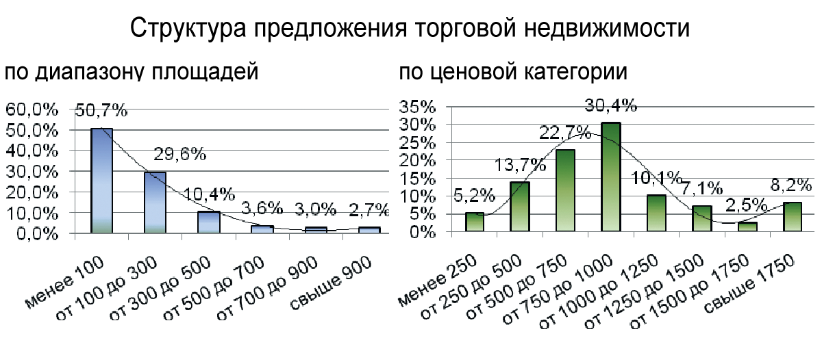 В марте наибольшее количество предложений торговой недвижимости в зависимости от диапазона площадей зафиксировано на объекты площадью до 100 кв. м (50,7%). В структуре предложения торговой недвижимости в ценовой категории наибольшую долю занимают помещения стоимостью от 750 до 1000 руб. за кв. м.