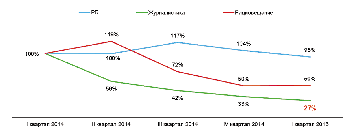 Снижение спроса на представителей журналистики и вовсе было одним из самых ощутимых за год: в первом квартале 2015 года количество вакансий снизилось на 73% относительно первого квартала 2014 года.