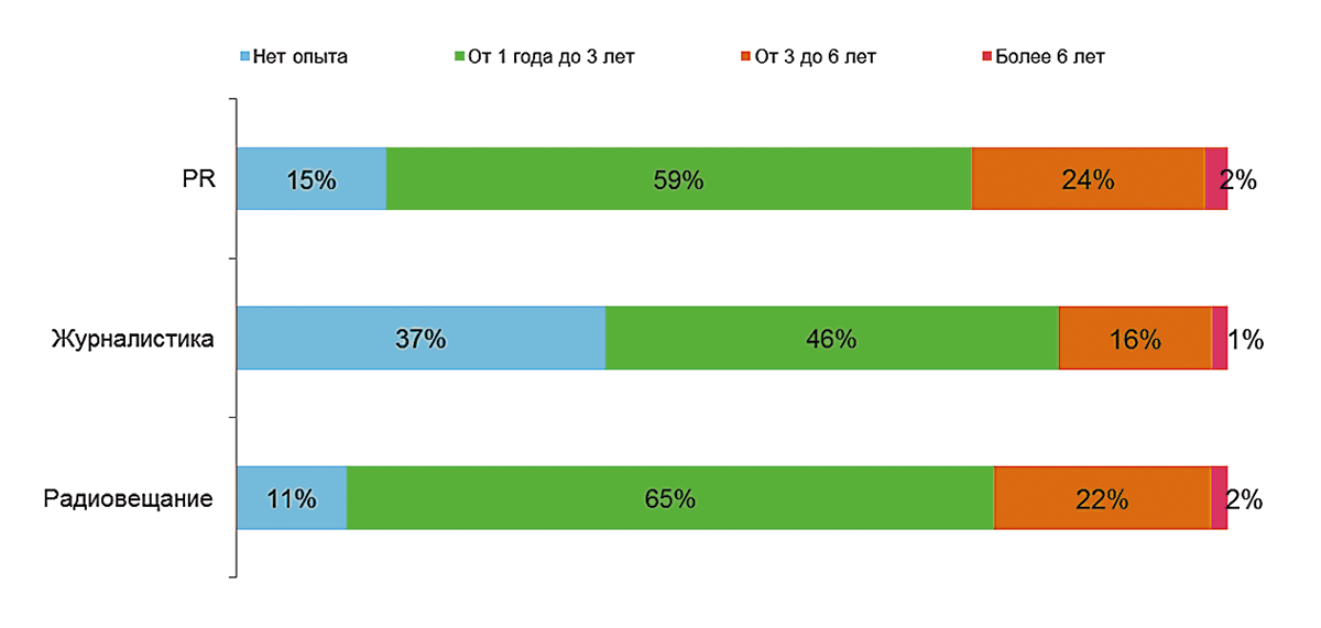 Большинство работодателей ищет себе кандидатов с опытом работы от одного года до трёх лет. При этом каждая третья вакансия в сфере журналистики подходит начинающему специалисту.