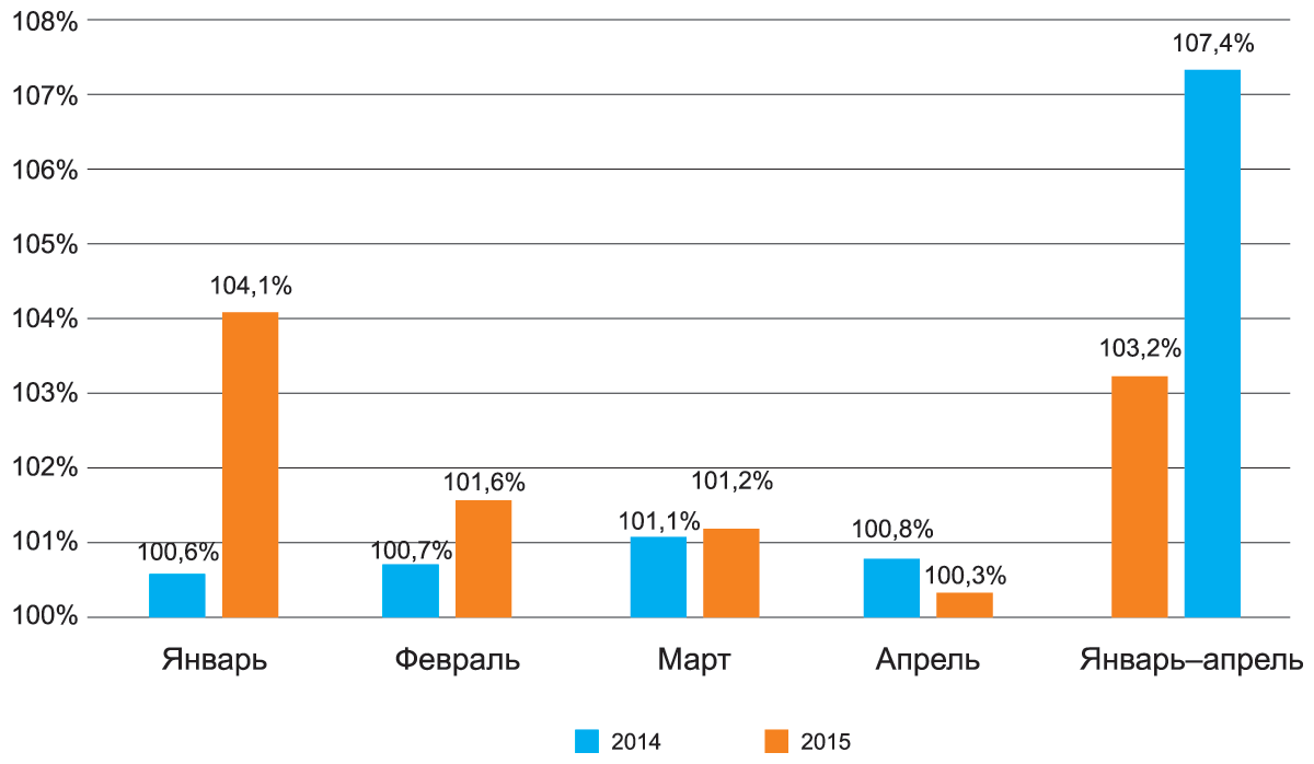 Впервые с начала года потребительские цены выросли менее чем на 1%, апрельский индекс инфляции составил всего 100,3%. Это гораздо меньше, чем в предыдущем месяце (тогда инфляция составила 101,2%), и даже меньше, чем в апреле 2014 года (100,8%).
