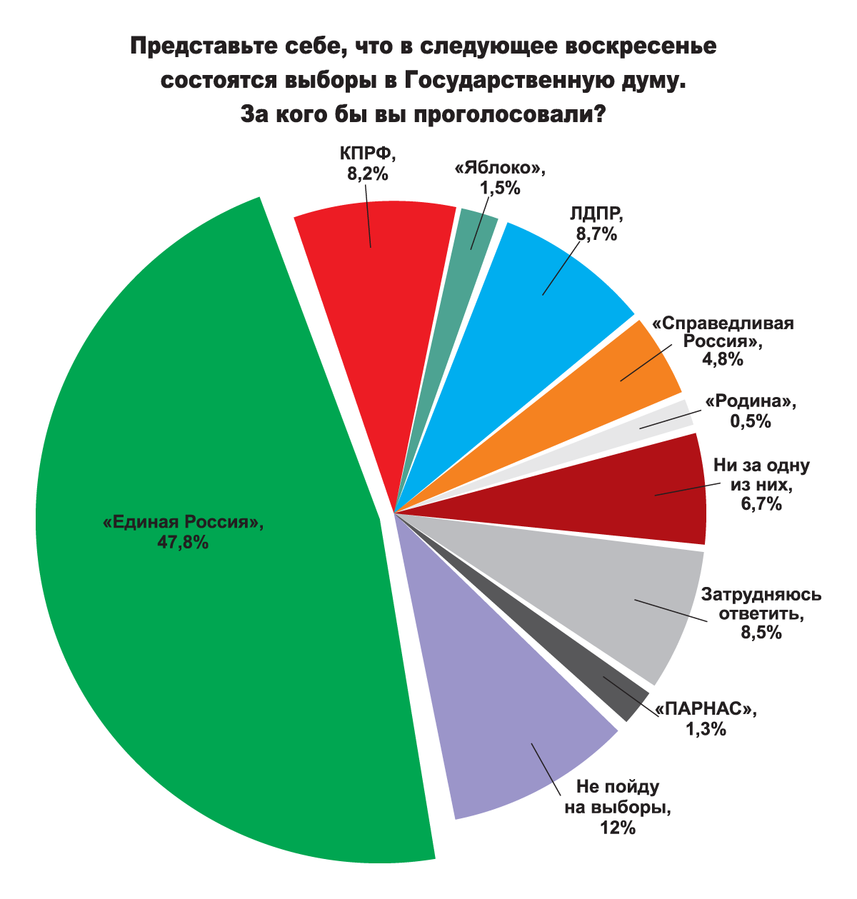 Для сравнения общероссийских показателей с показателями города Перми респондентам было предложено ответить на вопрос, использованный Федеральным исследовательским центром «Фонд общественного мнения»*, который звучал схожим образом: «Представьте себе, что в следующее воскресенье состоятся выборы в Государственную думу. Скажите, за какую партию вы бы проголосовали?»