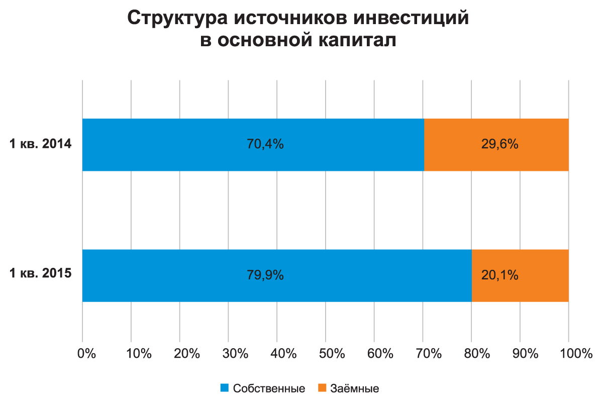В первую очередь снизилась доступность внешних источников финансирования. В результате доля собственных средств в объёме осуществлённых инвестиций увеличилась с 70% в январе—марте прошлого года до почти 80% за аналогичный период 2015 года. По этому показателю Пермский край лидирует среди всех регионов ПрФО: остальные в меньшей степени опираются на собственные средства, показатель регионов-конкурентов равен 60—66%.