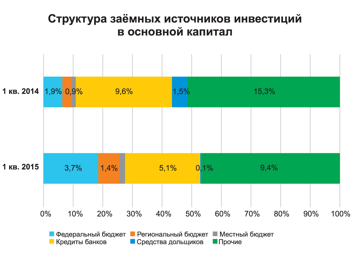 Ещё более резко, в 12,5 раза, снизился объём средств организаций и населения, привлечённых в долевое строительство. В первом квартале 2015 года их абсолютный объём составил всего 32 млн руб.