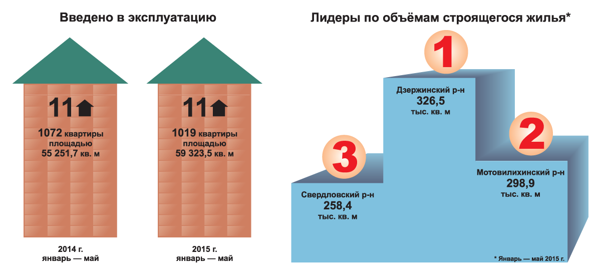 Со ссылкой на городской департамент градостроительства и архитектуры аналитический центр «Медиана» сообщил, что в краевом центре за первые пять месяцев года было введено в эксплуатацию 11 многоквартирных домов площадью более 59 тыс. кв. м (59 323,5 кв. м) с общим числом квартир 1019. Для сравнения: за аналогичный период 2014 года застройщиками было построено также 11 многоквартирных домов, или 1072 квартиры, жилой площадью 55 251,7 кв. м.