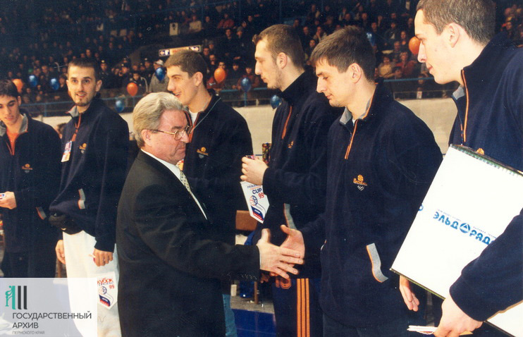 Губернатор Геннадий Игумнов поздравляет игроков баскетбольного «Урал-грейт»