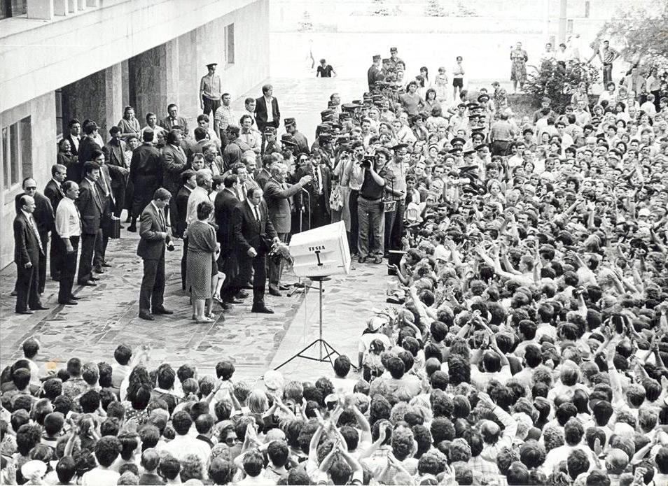 Мы с Г.И. и оператором А.Н. стоим в нижнем фойе ЗС, ждём, когда Борис Ельцин выйдет из-за угла гардероба — там тогда был скрытый ход на второй этаж в комнаты отдыха главы областного Совета. Я несколько раз нервно выбегал вперёд за угол смотреть: идет- нет… Все охранники «девятки» и местного ФСБ привыкли к нашим перемещениям по фойе и стояли спокойно. Наконец, Борис Ельцин показался. Мы начинаем снимать, Г.И. с микрофоном в руке выходит навстречу к Ельцину, улыбается и тут личная охрана Президента резко кидает её к стене и жестко прижимает! Ельцин проходит мимо, не моргнув глазом. Немая сцена… При этом ни меня, ни оператора никто не прессует. Оператор «автоматом» камерой провожает Ельцина до выхода и останавливается. Он «на привязи». Не было тогда радиопетличек и радиосистем. Микрофон журналиста был соединён с камерой шнуром. Не мог оператор, не отсоединив его, двигаться дальше, а журналист с микрофоном в руке был прижат к стенке гардероба. Отсоединив микрофон, мы с оператором побежали за Ельциным на крыльцо ЗС. Там и снимали знаменитое выступление Ельцина перед пермяками.