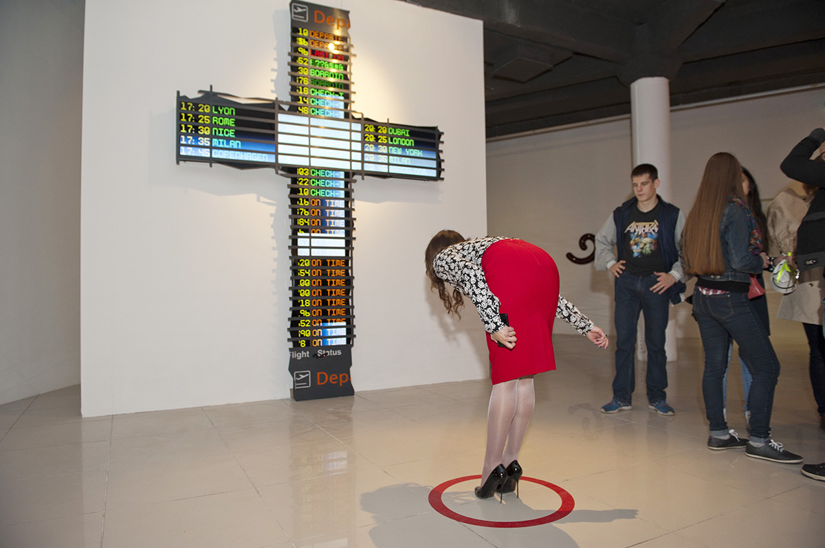 Апофеоз этого мира агрессивных медиа — «Большой говорящий крест». Инсталляция в форме креста создана из обломков действующего информационного табло аэропорта, по которому бегут сообщения о прилётах и отлётах. Если встать напротив креста и поклониться, раздаётся грохот и крест начинает сиять белым светом. Возможно, это намёк на новый культ, который возникнет в будущем на обломках информационной цивилизации.