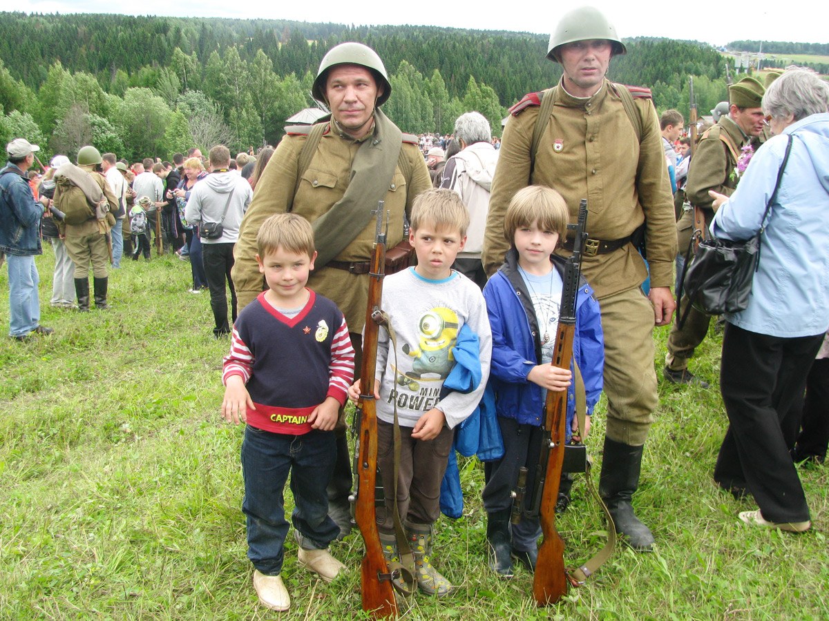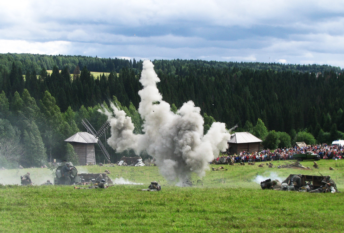 Бой начался. «Наши» наступали от подножия холма. Громкие очереди и одиночные выстрелы рождали далёкое эхо в окрестных лесах. Перебежки, укрытия, сигнальные ракеты, дымовые завесы, короткие затишья, взрываемые грохотом очередной атаки, — всё выглядело очень реалистично, по крайней мере для тех, кто настоящей войны не видел. Взрывы гранат приводили публику в абсолютный восторг. Пал первый вражеский рубеж, казалось, что победа близка, но противником была организована вторая линия обороны. Кроме того, на поле появился вражеский броневик. Атака увязла, но ненадолго. «Красноармейцы» выкатили противотанковую пушку. Массированная атака при поддержке артиллерии стала победной. Прикрывшись дымовой завесой, уцелевшие «фашисты» под свист зрителей и крики «ура» наступающих драпали в лес. Победа! Восторженные крики, рукоплескание. Слышны одиночные выстрелы — это салют в честь победы. Периметр прорван, зрители смешались с воинами. Фото на память из серии «Я и...», возможность «стрельнуть» вверх из настоящей винтовки.