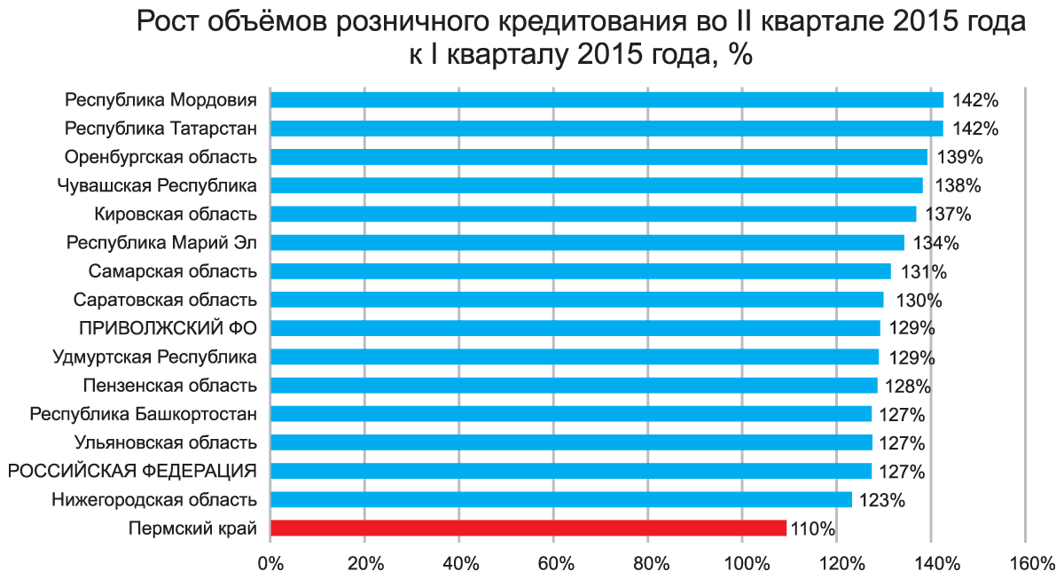 Статистика по Пермскому краю полностью подтверждает это утверждение. По сравнению с прошлым годом кредитование по-прежнему находится в серьёзнейшем провале. В январе—июне 2014 года в Пермском крае в рамках розничного кредитования было выдано 77 млрд руб., а за тот же период 2015-го — 39 млрд руб. Разница ровно в два раза.
