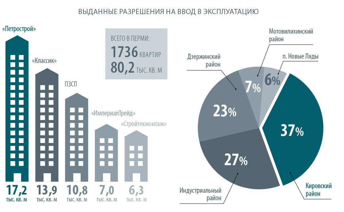 Статистика демонстрирует, что больше всех за январь—июнь 2015 года построило ООО «Петрострой», которое ввело в эксплуатацию дом на ул. Автозаводской, 30 общей площадью более 17 тыс. кв. м. «Петрострой» зарегистрирован в Ленинградской области, в Перми реализует несколько проектов. По данным «Коммерсантъ Картотека», общество было образовано в мае 2009 года, 80% принадлежит Людмиле Яковлевой, 20% — гендиректору Дмитрию Ипатову.