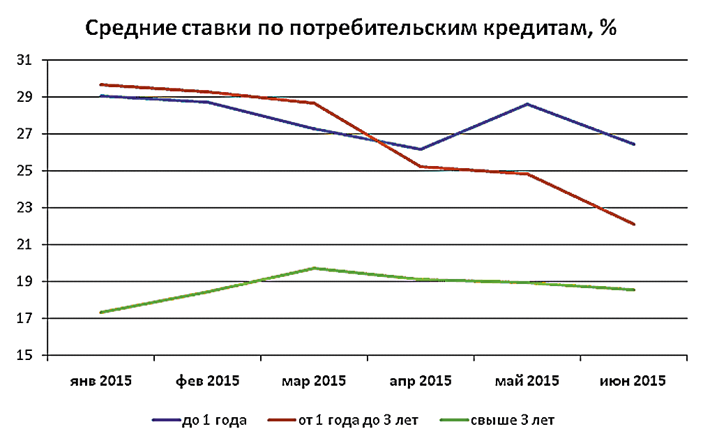 В течение второго квартала текущего года средние ставки по потребительским кредитам снизились на 1—5% в зависимости от срока и вида кредита. Такую информацию содержат официальные публикации Банка России.