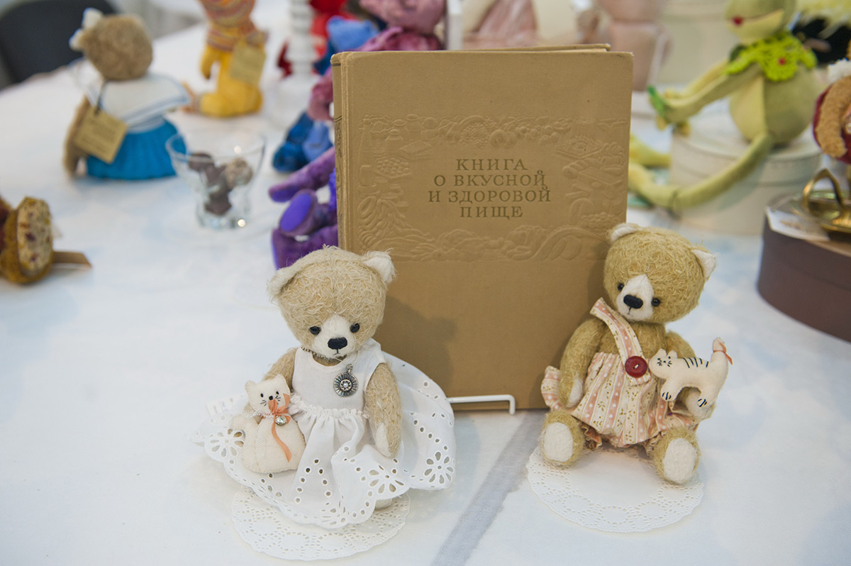 Основа выставки — куклы и игрушечные медведи, хотя, конечно, без всевозможных зайцев, котиков и даже военной техники тоже не обошлось. Куклы здесь самые разные: из фитоматериалов, из бумажных салфеток, из лоскутков, из стекла и даже из мыла и макаронных изделий! В целом экспонаты можно разделить на две категории: современные авторские игрушки и исторические. Большинство экспонатов на выставке продаются, но есть и коллекции, с которыми их владельцы ни за что не расстанутся.