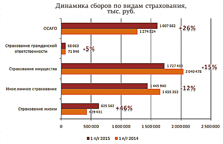 Однако по большей части эта стабильность носит технический характер. По словам директора Пермского филиала АО «СОГАЗ» Елены Нестеровой, в абсолютном выражении наибольший прирост сборов на страховом рынке Пермского края произошёл в ОСАГО, а причина этого — повышение тарифов на обязательную «автогражданку» осенью прошлого и весной текущего года. В результате двухэтапного повышения тарифов средняя стоимость полиса ОСАГО в Пермском крае увеличилась с 3,7 тыс. руб. в первом полугодии 2014 года до 5,2 тыс. руб. в первом полугодии 2015-го, то есть на 42%. Однако рост стоимости полиса и экономический кризис привели к тому, что количество купленных полисов ОСАГО уменьшилось, и весьма значительно — на 11%. В результате сбор премий вырос только на 26%.