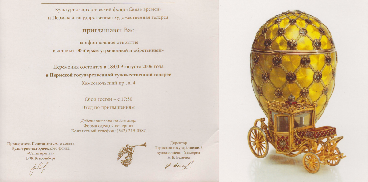 Выставка ювелирных изделий Карла Фаберже из коллекции Вексельберга экспонировалась в художественной галерее в течение двух с половиной месяцев и пользовалась огромной популярностью. Огромные очереди выстраивались с самого утра и, по воспоминаниям сотрудников галереи, довольно сложно было попасть на работу — люди думали, что они так хотят проникнуть на выставку без очереди.