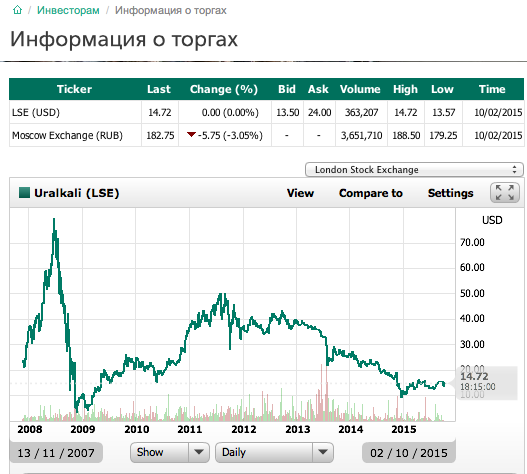 Любопытно, что слияние «Уралкалия» и «Сильвинита» не повлекло за собой стремительного роста акций компании, как это было летом 2008 года на фоне информации о возможной смене собственника. Как видно из графика, капитализация АО «Уралкалий» даже имеет тенденцию к уменьшению.