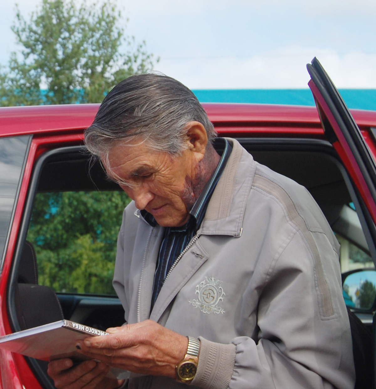 В 1973 году я на пожарном вертолёте летал вручать ему орден «Знак Почёта». Дважды пришлось лететь: в первый раз не застал. Сели с вертолётчиком на крылечке и думаем: где же его искать? За орден отчитываться нужно! Вдруг окно избы открывается, и мать этого охотника, которой в то время было 92 года, из ружья шлёп в ястреба. Он упал к нашим ногам. Оказывается, у неё там курицы ходили, а ястреб на них нацелился. Она сказала, что через два дня охотник должен прийти домой, сейчас он в тайге делает зимовья. Через два дня опять полетели, на этот раз вручили. У него на двери места пустого не было от автографов. Мы тоже свои внизу поставили. А выше всех знаете чья подпись стояла? Писателя Юрия Арбата. Он там долго находился, изучал быт. И книгу написал «Сорок памятных зарубок» про нас.