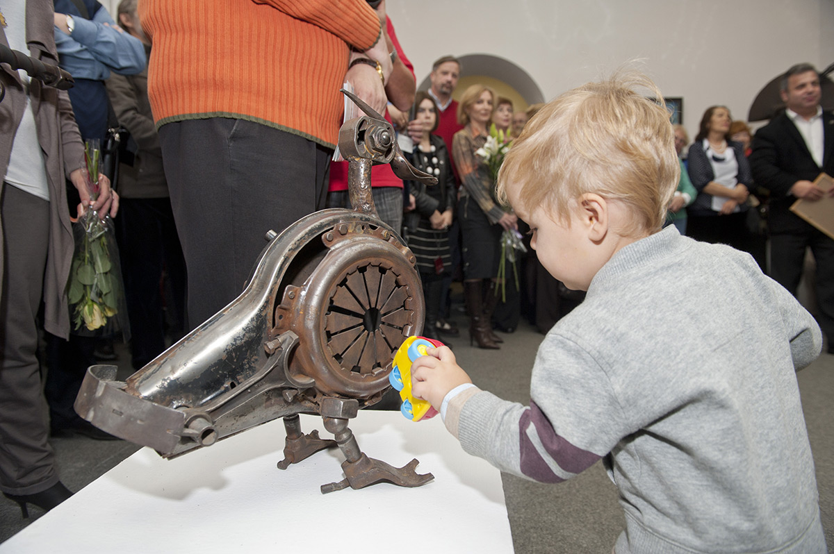 У входа в выставочный зал Дома художника высится его «Сейф-центурион», важный, как самовар, а сразу после входа — совсем свежее произведение, буквально за день до вернисажа созданное: пермский «медведь в жертвенной позе», морда — лопата, лапы — грабли… Творчество Рустама Исмагилова — это мастеровитость в сочетании с удивительным взглядом художника, который в старых механизмах видит не только людей и животных, но и целые истории, драмы или комедии.