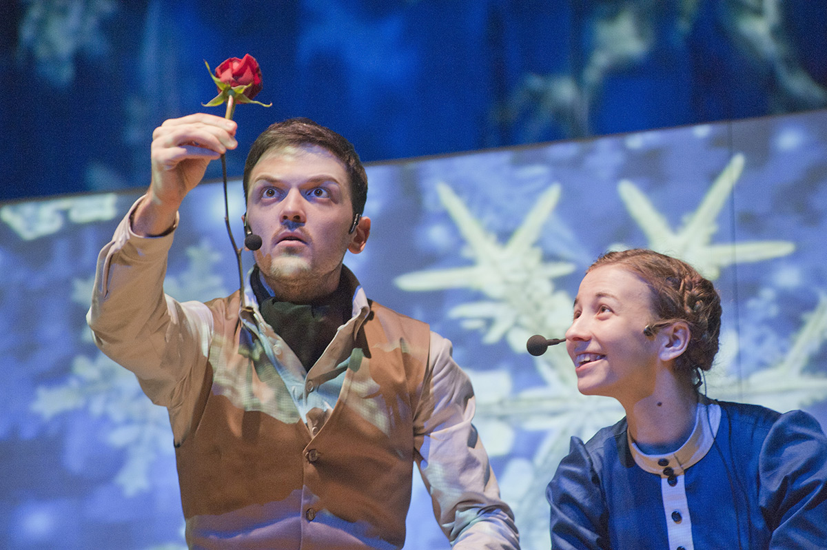 Четыре премьеры в год, и для каждой эксклюзивная музыка импортного композитора и работа импортного художника (постоянные соавторы Янушкевича — композитор Александр Литвиновский и художник-постановщик Татьяна Нерсисян из Белоруссии) — это довольно затратно для небольшого муниципального театра. «Снежная королева» делалась в режиме экономии и поэтому потребовала от постановщиков изобретательности. Вместо декораций на сцене — белый планшет, на три стороны которого транслируется видео: то кромешный снегопад, то морозные узоры на стекле, то сказочный сад. Кукол тоже не так много: Янушкевич, в принципе, любит живых актёров в театре кукол, и здесь большинство ролей — Кай и Герда, Маленькая Разбойница, Принц и Принцесса и многие другие — отданы живым актёрам.