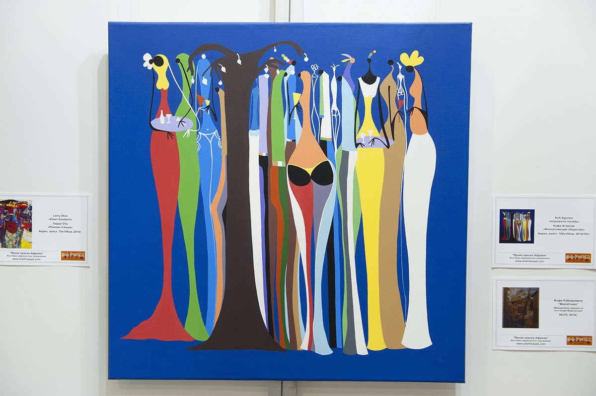 Другой этнический павильон, не менее, а то и более экзотичный, чем бурятский, находится в стороне от центральной аллеи. Впервые в истории «Арт-Перми» на выставке представлено творчество художников Африки — полотна живописцев из Ганы и Мали. Эти работы ни этническими, ни наивными не назовёшь: речь идёт о художниках высокопрофессиональных, коммерчески успешных и слегка космополитичных. Но не зря экспозиция называется «Яркие краски Африки»: действительно, знойная природа и южный темперамент дают о себе знать — все полотна чрезвычайно декоративны и жизнелюбивы. Один из высоких гостей вернисажа даже высказался в том смысле, что хотел бы жить в доме, расписанном такими вот фресками.