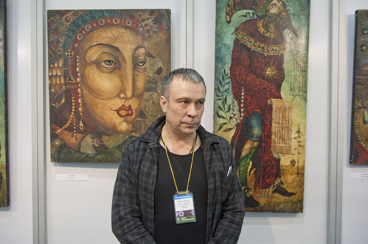 Пермские художники, расположившиеся поблизости, демонстрируют принципиально иной подход: все они люди ищущие, каждый год предлагающие что-то принципиально отличное от прошлогоднего. Так, Максим Титов на сей раз не стал никого провоцировать — на его стенде нет социальных и политических высказываний, но есть совершенно новый для него триптих по мотивам русской иконописи — очень прочувствованный, замечательный и по композиции, и по технике.