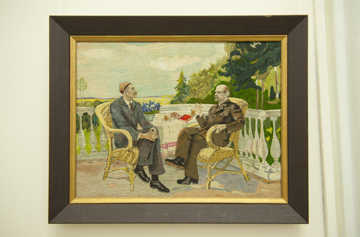 ХХ и XXI век вышивать не перестали. В последнем зале представлены работы художницы Александры Бычковой-Кольцовой в стиле ар-деко, и они смотрятся очень современно. На стене скромная, но благородная вышивка белой нитью — по легенде, наволочка для супруги Черчилля, приезжавшего в Россию с визитом.