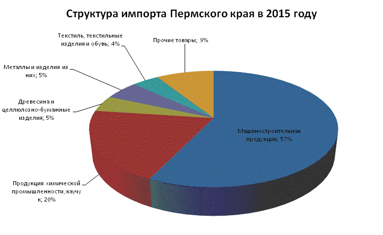 Структура импорта Пермского края чуть менее концентрированна, хотя и здесь основная доля приходится на две товарные группы: машиностроительная продукция (57% от общего объёма импорта) и продукция химической промышленности (20%). Ни по одной товарной группе роста импорта в 2015 году не произошло — всех видов продукции мы стали потреблять меньше.