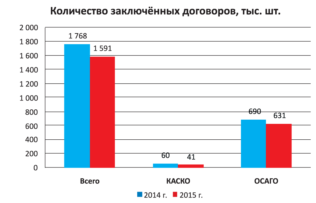 Есть ещё одно объективное свидетельство динамики страхования в 2015 году, свободное от влияния тарифов. По данным Банка России, количество проданных полисов сократилось на 10%, в абсолютном выражении — на 176 тыс. штук. Наиболее сильно пострадал сегмент страхования от несчастных случаев и болезней — минус 9%, или 106 тыс. полисов. Вторым по значимости стало, как ни странно, снижение количества заключённых договоров ОСАГО — минус 9% (59 тыс. штук). Это снижение отчасти объясняется распространением поддельных полисов, не попадающих в официальную статистику. Второй фактор — резкое увеличение стоимости полиса, в результате чего для части автовладельцев он стал недоступен.