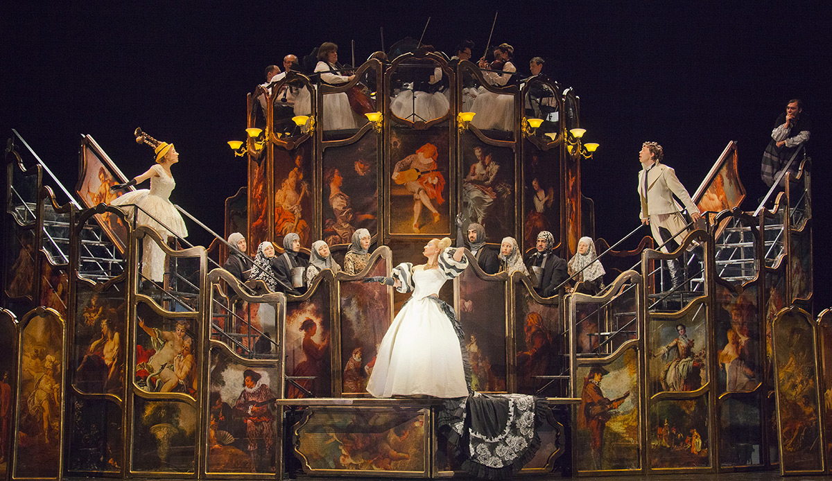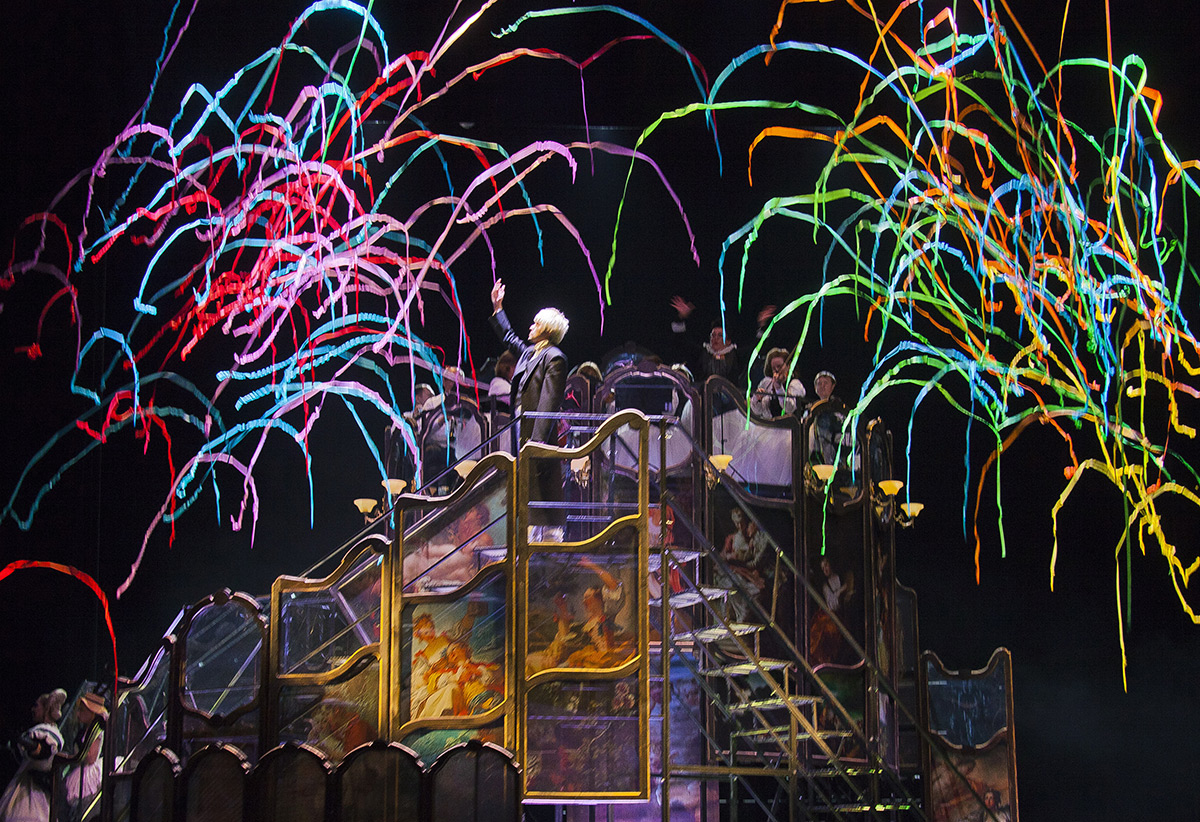 Во втором действии на сцене настоящая инсталляция: в сложносочинённой конструкции Шилькрот объединил дворец с цирком — здесь и ампирные изогнутые линии, и фривольные репродукции Антуана Ватто, и нечто вроде циркового зала с высокими рядами сидений и лестницами, с оркестром на возвышении, под самым «куполом».
