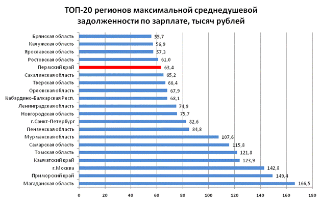 Ещё один фактор, который негативно влияет на уровень жизни даже тех, кто сохранил работу, — это задержка зарплаты. По данным Росстата, по состоянию на 1 марта в Пермском крае задолженность по заработной плате составляла 20 млн руб., увеличившись по сравнению с началом года в шесть раз. На нестабильность ситуации указывают значительные колебания этого показателя в течение прошлого года, которые продолжаются и в 2016-м. Сегодня в расчёте на одного пострадавшего работника сумма просроченной задолженности равна 63 тыс. руб., что в полтора раза больше, чем в среднем по стране. Не считая Самарской области, это максимальный показатель среди всех регионов Приволжского федерального округа.
