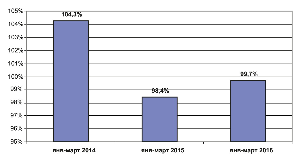 Если говорить о реальном секторе экономики, то изменения, произошедшие здесь, в основном укладываются в картину сдержанной негативной динамики. Объём промышленного производства в первом квартале 2016 года сократился по сравнению с тем же периодом прошлого на 0,3%. Годом ранее официальная статистика фиксировала спад на 1,6%.