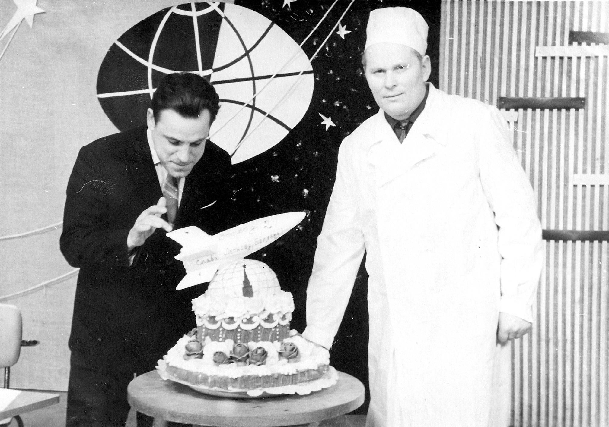 Фрагмент прямого эфира Пермской студии телевидения. Март 1965 года. Пермский кондитер по своей инициативе испек торт по случаю приземления космонавтов и принес его в студию. Слева — Григорий Барабанщиков