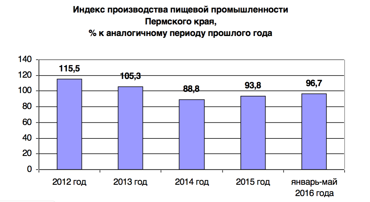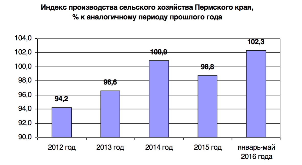 Однако это всего лишь эпизоды, а в целом ускоренного развития ни сельскохозяйственной отрасли, ни пищевой промышленности в Пермском крае не происходит. По результатам пяти месяцев 2016 года объём сельскохозяйственного производства увеличился на 2% по сравнению с аналогичным периодом прошлого года, в пищевой промышленности зафиксирован спад на 3,3%.