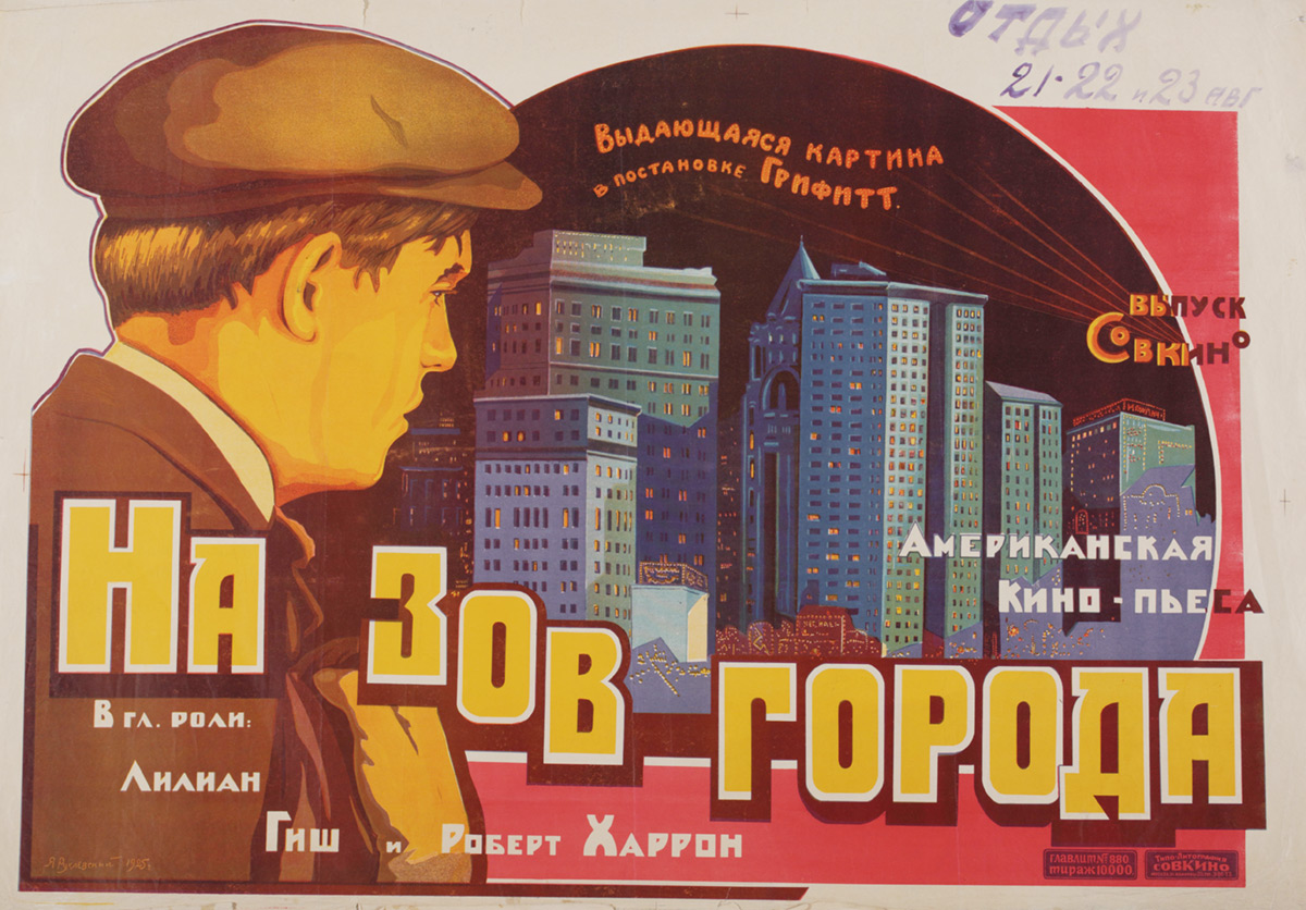 Настоящий расцвет советского киноплаката начался в 1924 году, когда было создано «Совкино» с собственной типографской базой для печати афиш. Там работал и Яков Рукиевский, которого Тамара Шматёнок называет основателем советской школы киноплаката. Показанный на выставке плакат к фильму Дэвида Уорка Гриффита «На зов города» — достойная иллюстрация. «Потрясающее понимание цвета, ритма, образа, соотношение детали и целого! — восхищается куратор выставки. — Художник по-своему трактует тему фильма — «человек и город».
