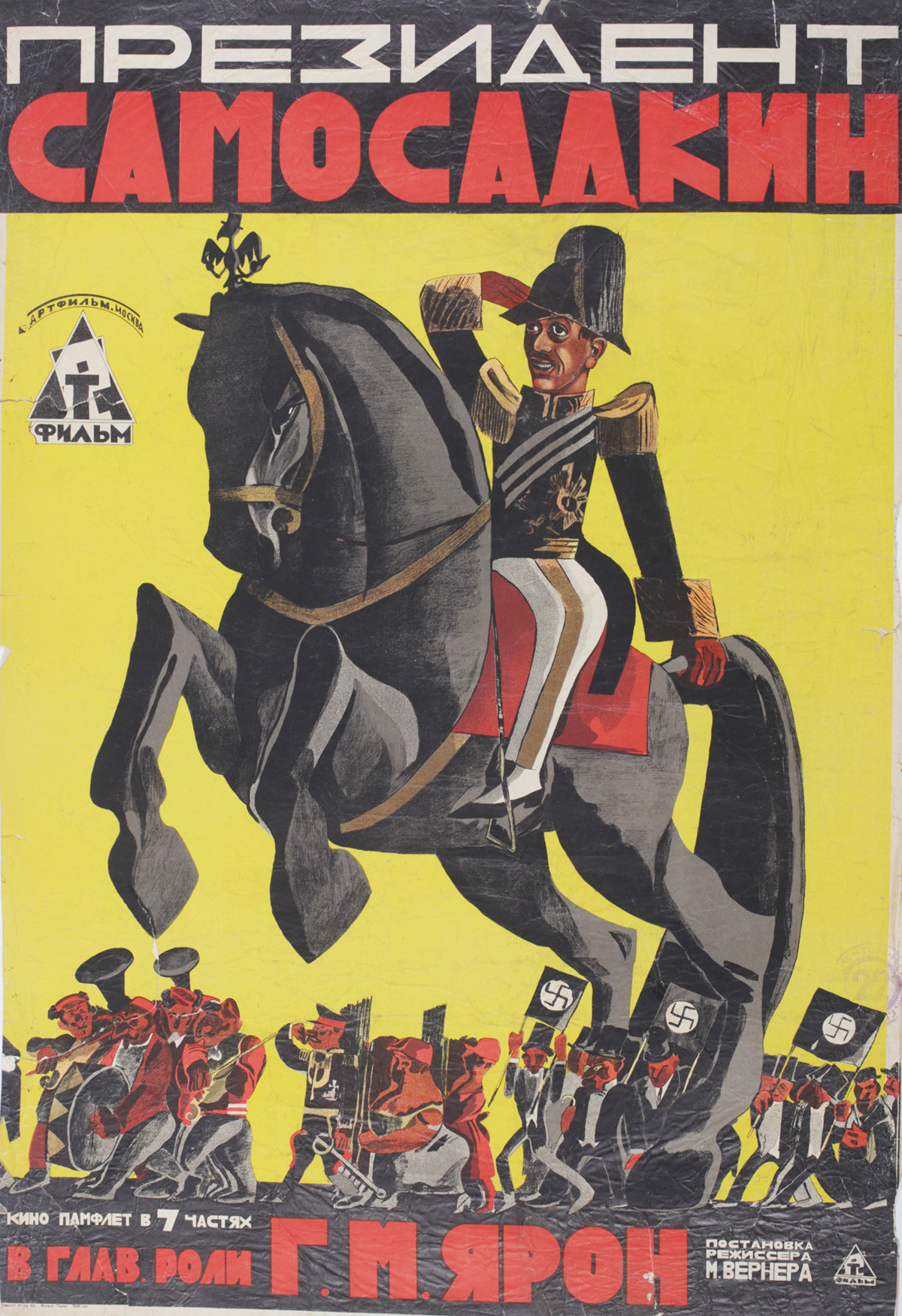 Столь же примечательный плакат, опять-таки неизвестного автора, — к фильму 1926 года «Президент Самосадкин». Снова видно влияние супрематизма, на сей раз соединённое с чертами лубка и стилистикой политической карикатуры. В фильме, сатирической комедии, речь идёт о бедной европейской стране, президент которой ради пополнения бюджета решает торговать воздухом, а на плакате изображены толпы людей в чёрном, марширующие со свастиками на штандартах. Возможно, в подтексте была Италия, а может, это гениальное предвидение…