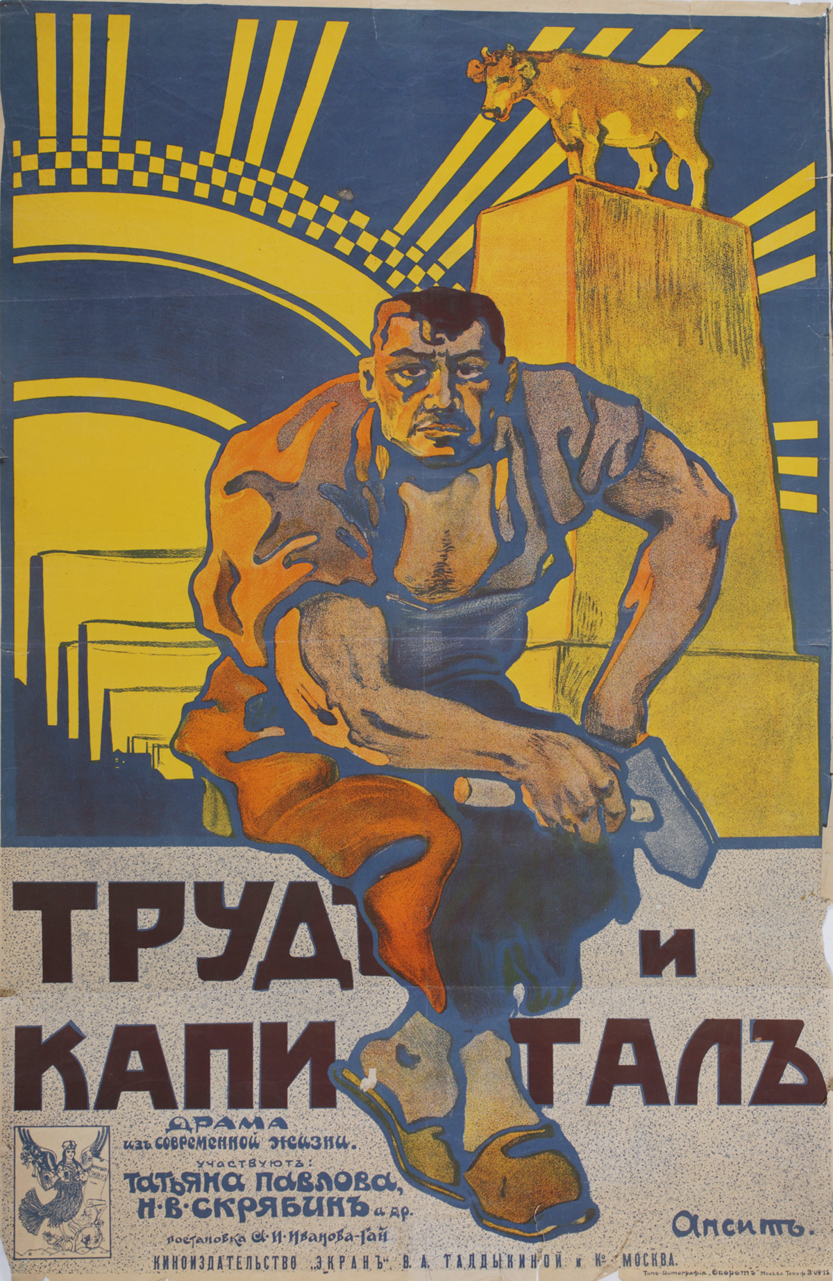 Самый ранний из показанных плакатов — работа Александра Апсита, мастера плаката политического. За всю жизнь он нарисовал только два киноплаката, один из которых не сохранился, а второй был отпечатан небольшим тиражом, но в Пермской галерее отыскался экземпляр. Публицистический фильм «Труд и капитал» был снят в 1918 году, и его афиша сделана в лучших традициях политической агитации того времени.