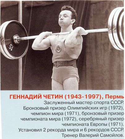 Мировой рекорд пермского штангиста Геннадия Четина в троеборье — 367,5 кг.