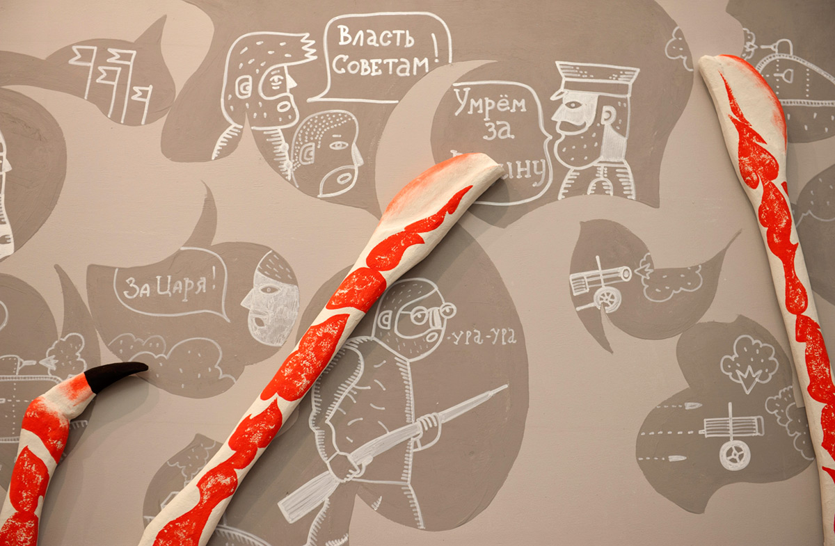 Завершается выставка весело: на нескольких стеклянных столешницах, расположенных четырьмя слоями друг над другом, нарисованы граффити, которые когда-то реально были написаны на партах в университете: