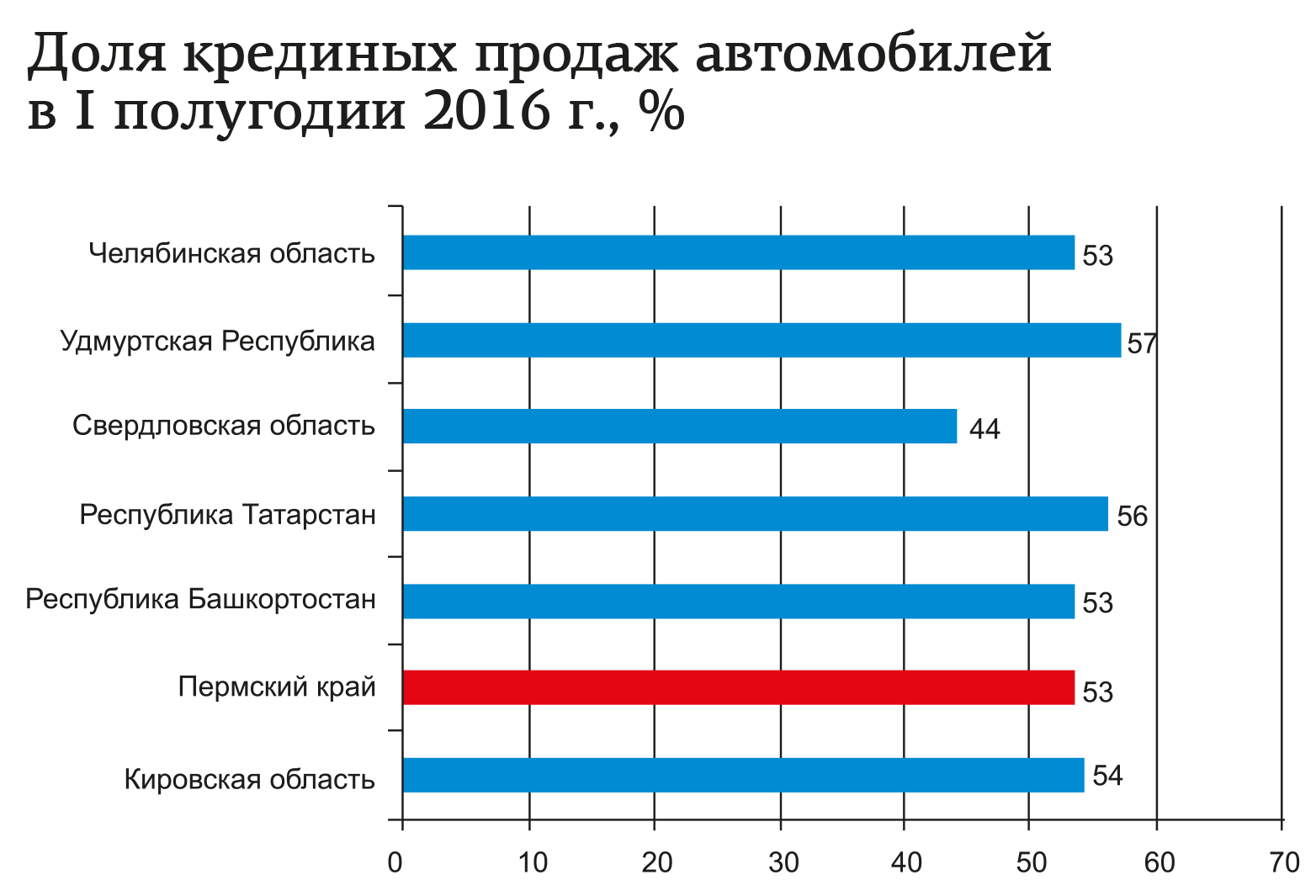 Зато если говорить о доле кредитных продаж автомобилей, то она, напротив, выше существовавшей до кризиса. Если в целом по России этот показатель к концу 2014 года составлял 30%, то сейчас он равен 44%. Показатель Пермского края ещё выше: 50% в первом квартале 2016 года и 56% — во втором.