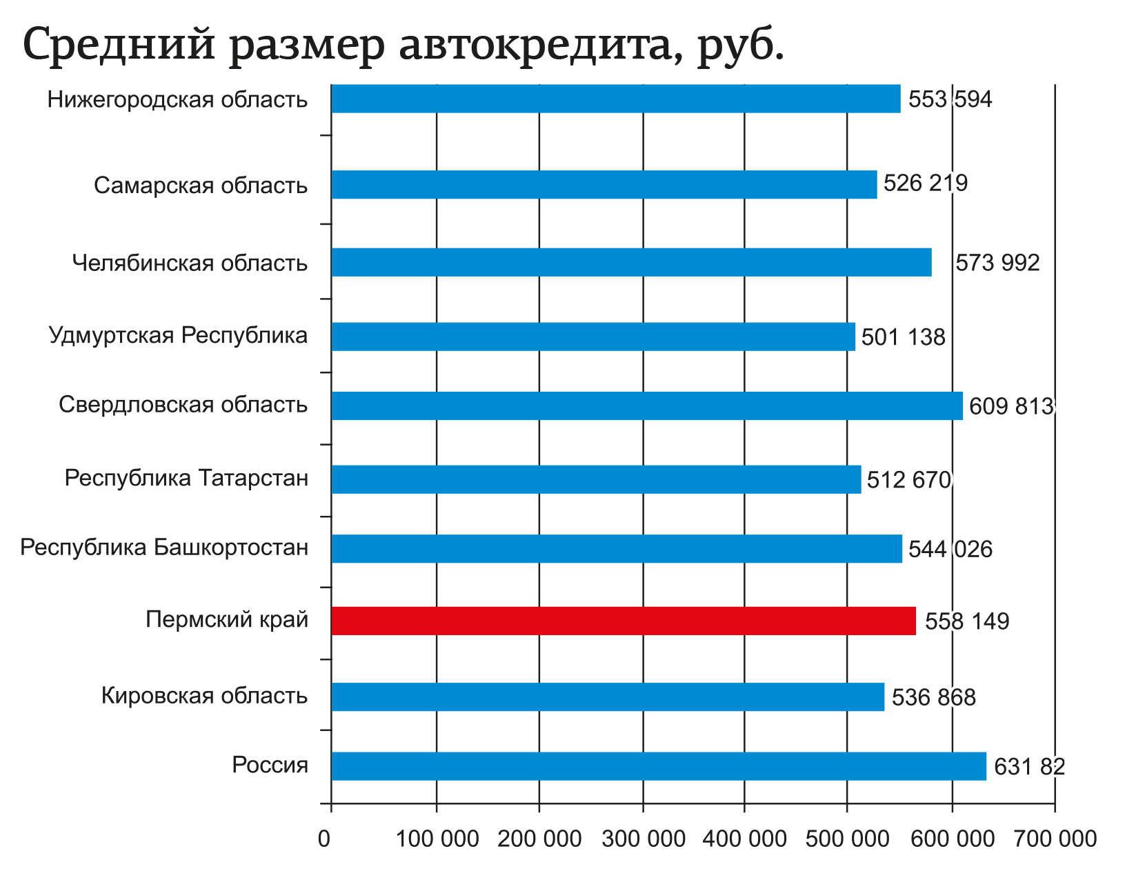 Впрочем, надо отметить, что по средней сумме выдаваемых автокредитов Пермский край серьёзно уступает большинству регионов страны: по этому показателю он занимает лишь 64-е место из 83. Это минимальный показатель среди регионов-конкурентов, также Пермский край существенно уступает среднему по стране показателю, равному 632 тыс. руб.